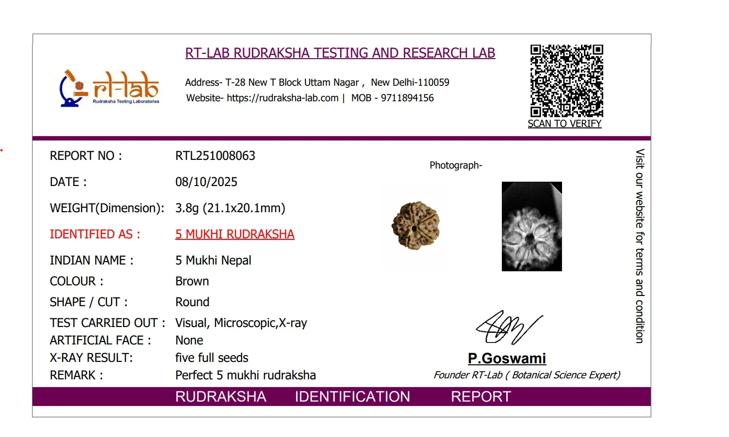 Each 5 Mukhi Nepal Rudraksha is carefully verified through Digital X-Ray Lab Certification to ensure genuine natural mukhi lines and internal structure. At Rudraksha.Store, we guarantee 100% authentic, natural & full-compartment beads, purified with Ganga Jal and blessed before shipping.